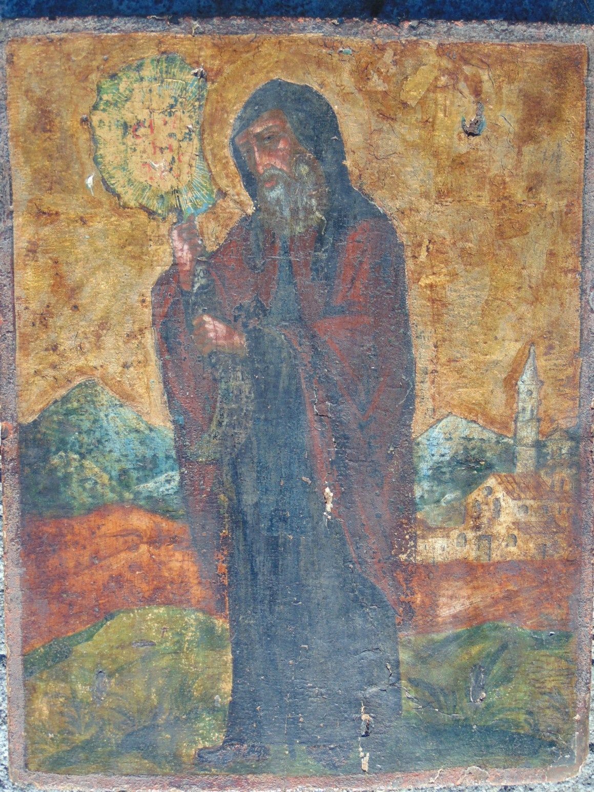 Ancienne (je dirais, peut-être XIXe siècle), à peu près 42 cm de haut sur 30 cm de large, très sombre. Le peu que j'en puis distinguer, c'est un ascète, un moine dans un paysage indéfini, avec à l'arrière plan, côté droit, une église ou un monastère. A hauteur de visage, une sorte de "splendeur rayonnante" contenant une inscription à peu près illisible. Dans ses mains, il tient une espèce de chiffon sale.